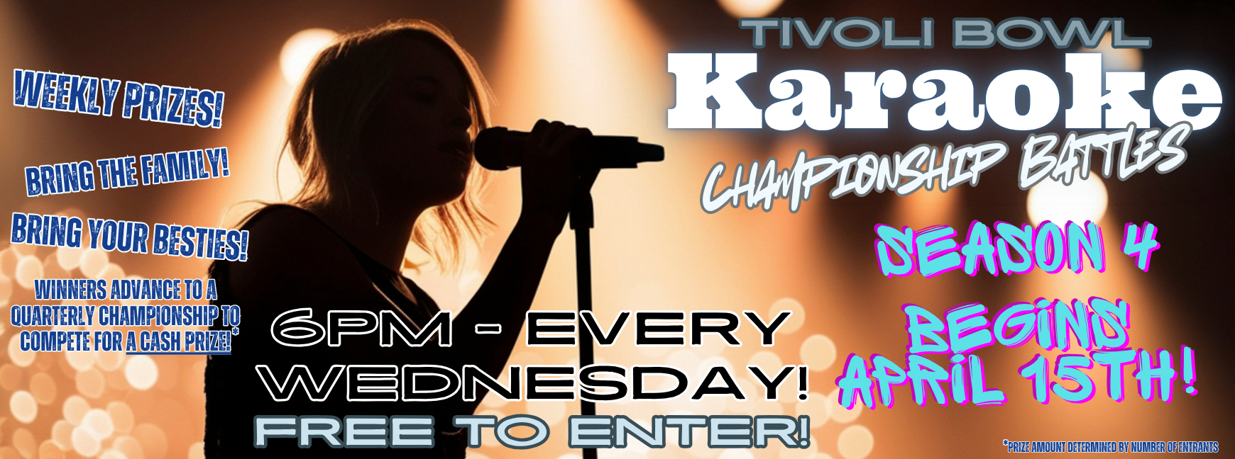 Every week, we will have an "open mic" for karaoke singers, no entry registration or fee required. Sing for fun or sing for battle, because each week, we will crown two "champions" that will win weekly food/drink or bowling prizes. The winners of each week will be invited to a special quarterly "Championship Battle" (entry fee of $20 required, to fund prize pool) and those champions will battle (next Championship Battle is scheduled for JULY 29th, 2026) for CASH PRIZES! (The amount of the cash prize depends on the number of entrants, but the totality of all entry fees for the Championship Battle will go towards the prize pool!)