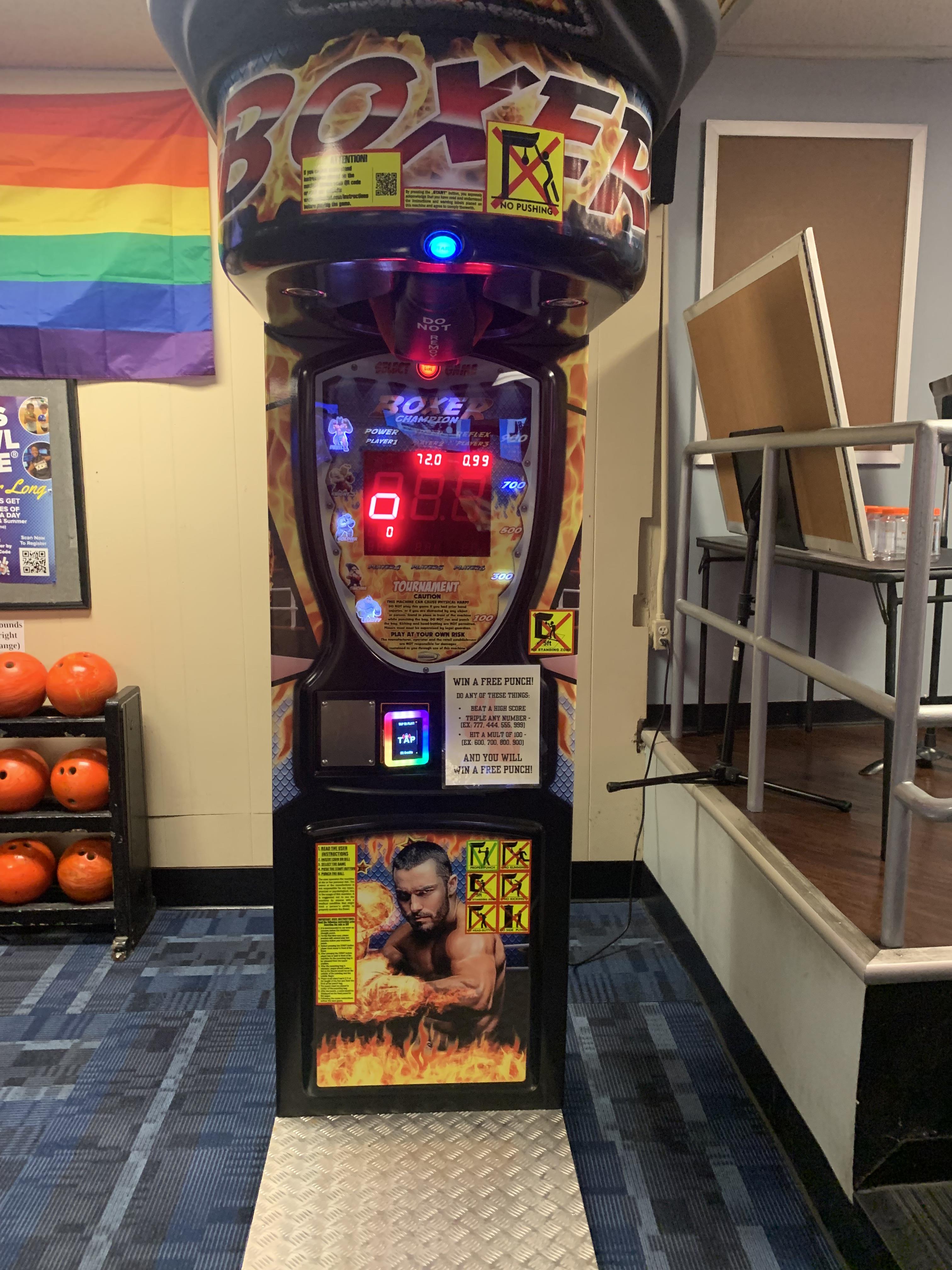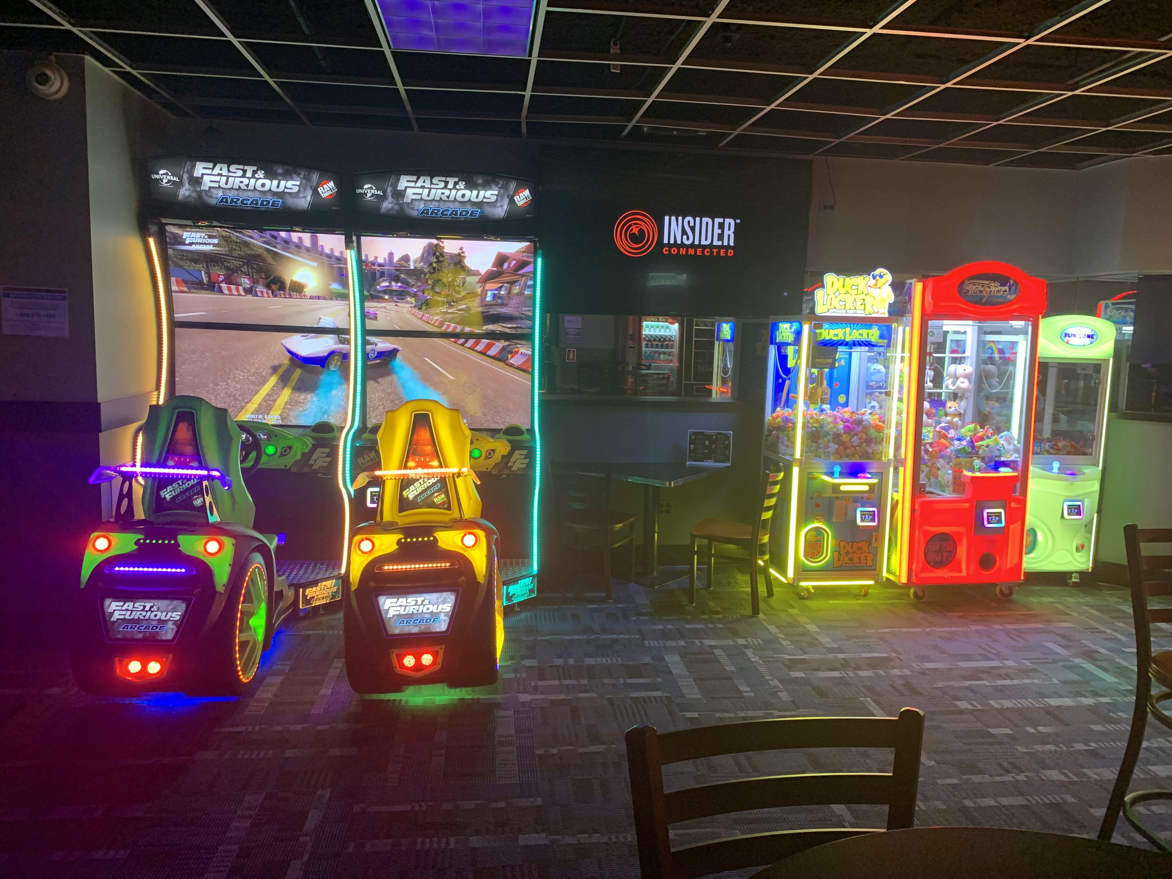 We feature head-to-head racing games and claw games (pictured above) to test your skill (and win fun prizes!), an assortment of well-maintained pinball tables, Exciting head-to-head play at our Dynamo Fire Air Hockey table, or perhaps you'd like to test your might by seeing how hard you can punch at our Boxer machine (located on the main concourse)! Coming soon, we will have another competitive two-player dance machine with StepManiaX!